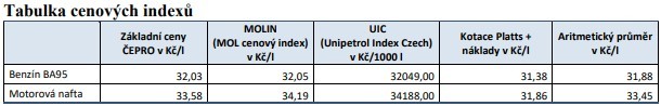 *Cenové indexy v sobě zahrnují sazbu spotřební daně účinnou pro den, pro který se maximální ceny regulovaných pohonných hmot stanovují. Při přepočtu Indexu Platts byly použity devizové kurzy ČNB pro USD a EUR účinné ke dni kotace.